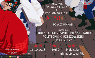 Nabór do Studenckiego Zespołu Pieśni i Tańca "POŁONINY" odbędzie się 16 października o 19:30 na małej sali gimnastycznej Politechniki Rzeszowskiej, na przeciw dawnego klubu "PLUS".